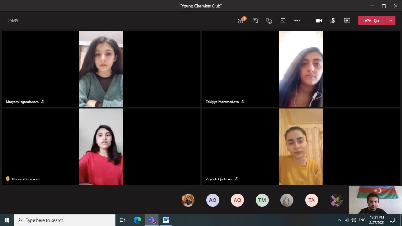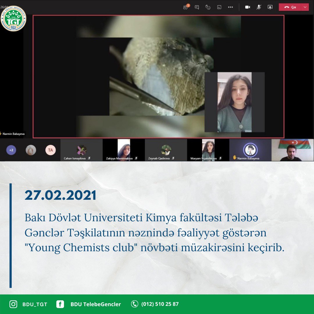 27.02.2021-ci ildə Bakı Dövlət Universiteti Kimya fakültəsi Tələbə Gənclər Təşkilatının nəzdində fəaliyyət göstərən "Young Chemists club" növbəti müzakirəsini keçirib. Müzakirəni Kimya fakültəsi Tələbə Gənclər Təşkilatı sədr müavini Qədirova Zeynəb açıq elan edib. Təlimçi İsgəndərova Məryəm müzakirənin mövzusu olan qələvi metallar haqqında klub üzvlərini maarifləndirmişdir. Daha sonra klub üzvlərindən Məmmədova Zəkiyyə, Babayeva Nərmin və İsmayılova Cahan mövzu haqqında çıxış edərək topladıqları məlumatları,video və fotoları təqdim etmişlər. Müzakirə Kimya fakültəsi Tələbə Gənclər Təşkilatının sədri Əli Qədirlinin çıxışı ilə yekunlaşmışdır.