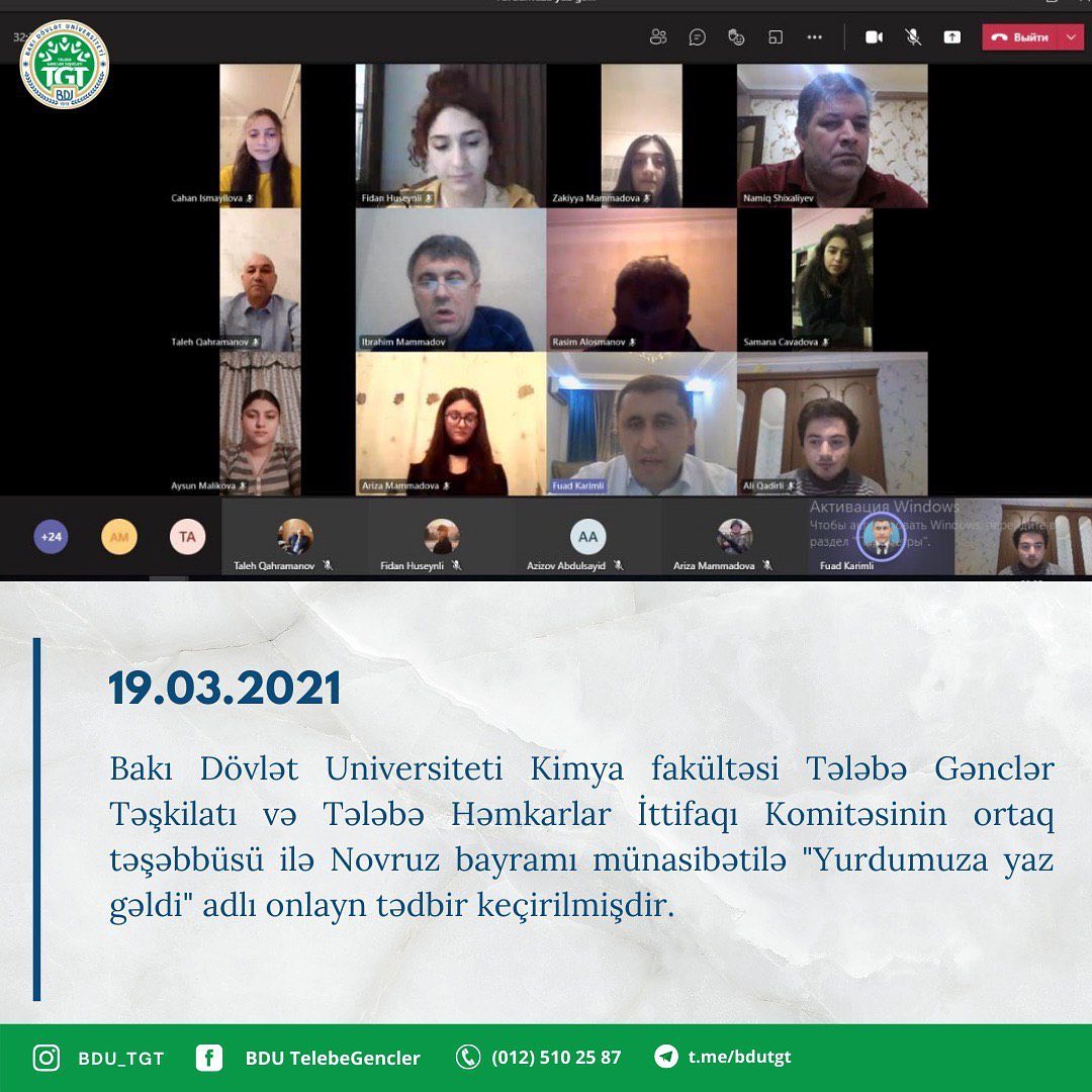 19 mart 2021-ci ildə Bakı Dövlət Universiteti Kimya fakültəsi Tələbə Gənclər Təşkilatı və Tələbə Həmkarlar İttifaqı Komitəsinin ortaq təşəbbüsü ilə Novruz bayramı münasibətilə "Yurdumuza yaz gəldi" adlı onlayn tədbir keçirilmişdir. Tədbir Kimya fakültəsinin birinci kurs tələbəsi Məmmədova Arizanın aparıcılığı ilə başlamışdır.