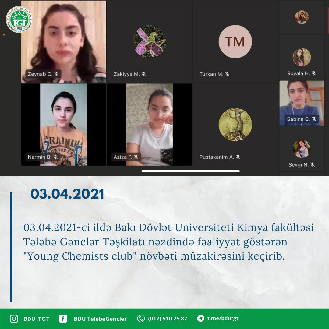 03.04.2021-ci ildə Bakı Dövlət Universiteti Kimya fakültəsi Tələbə Gənclər Təşkilatı nəzdində fəaliyyət göstərən "Young Chemists club" növbəti müzakirəsini keçirib. Təlimçi Qədirova Zeynəb xalkogenlər haqqında klub üzvlərinə məlumat vermişdir.
