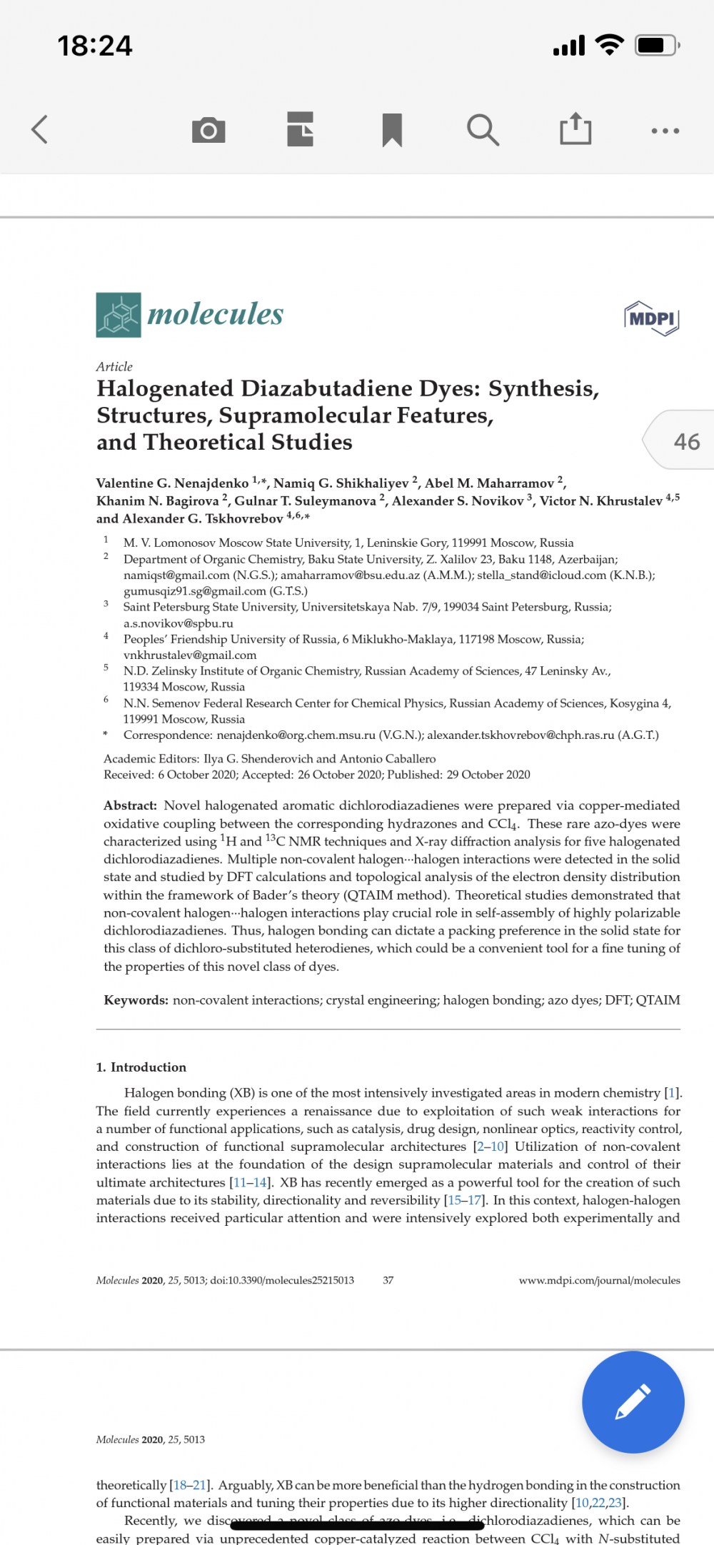 Bakı Dövlət Universitenin (BDU) Kimya fakültəsinin üzvi kimya kafedrasının müdiri, akademik Abel Məhərrəmov, kafedranın professoru Namiq Şıxaliyev, doktorontlar Xanım Bağırova və Gülnar Süleymanovanın həmmüəllif olduqları “Halogenləşdirilmiş dixlordiazabutadien boyaları- sintezi, quruluşları, supramolekulyar xüsusiyyətləri və nəzəri tədqiqatları” məqaləsi Molecules jurnalının xüsusi buraxılışına daxil edilmişdir. Məqalə əsasən dixlordiazabutadien boyalarında qeyri-kovalent halogen-halogen əlaqələrinin kristal dizaynda rolundan bəhs etmişdir. Molecules jurnalının Xüsusi buraxılışı qeyri kovalent qarşılıqlı təsirlərinə həsr olunmuş və bu növ əlaqələrin əhəmiyyətini vurğulamaq üçün məşhur ingilis yazıçısı Jonatan Sviftin “Qulliver lilipudlar ölkəsində” əsəri ilə obrazlı şəkildə müqayisə edilmişdir.