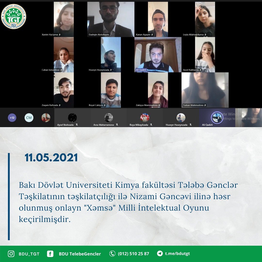 11.05.2021-ci ildə Bakı Dövlət Universiteti Kimya fakültəsi Tələbə Gənclər Təşkilatının təşkilatçılığı ilə Nizami Gəncəvi ilinə həsr olunmuş onlayn "Xəmsə" Milli İntelektual Oyunu keçirilmişdir. Yarış 2 qrup və bir final mərhələsindən ibarət olmuşdur. Sualları Kimya fakültəsi Tələbə Gənclər Təşkilatının sədri Əli Qədirli, sədr müavini Abdullayev Daşqın və II kurs tələbəsi İsayev İsa səsləndirmişdir. İntelektual oyunda "Alphas" komandası I yerin, "Game of Debat" komandası II yerin, "Gəncəm" komandası isə III yerin qalibi olmuşdur. Yarışın qaliblərinə Tələbə Gənclər Təşkilatı tərəfindən sertifikat təqdim olunmuşdur.