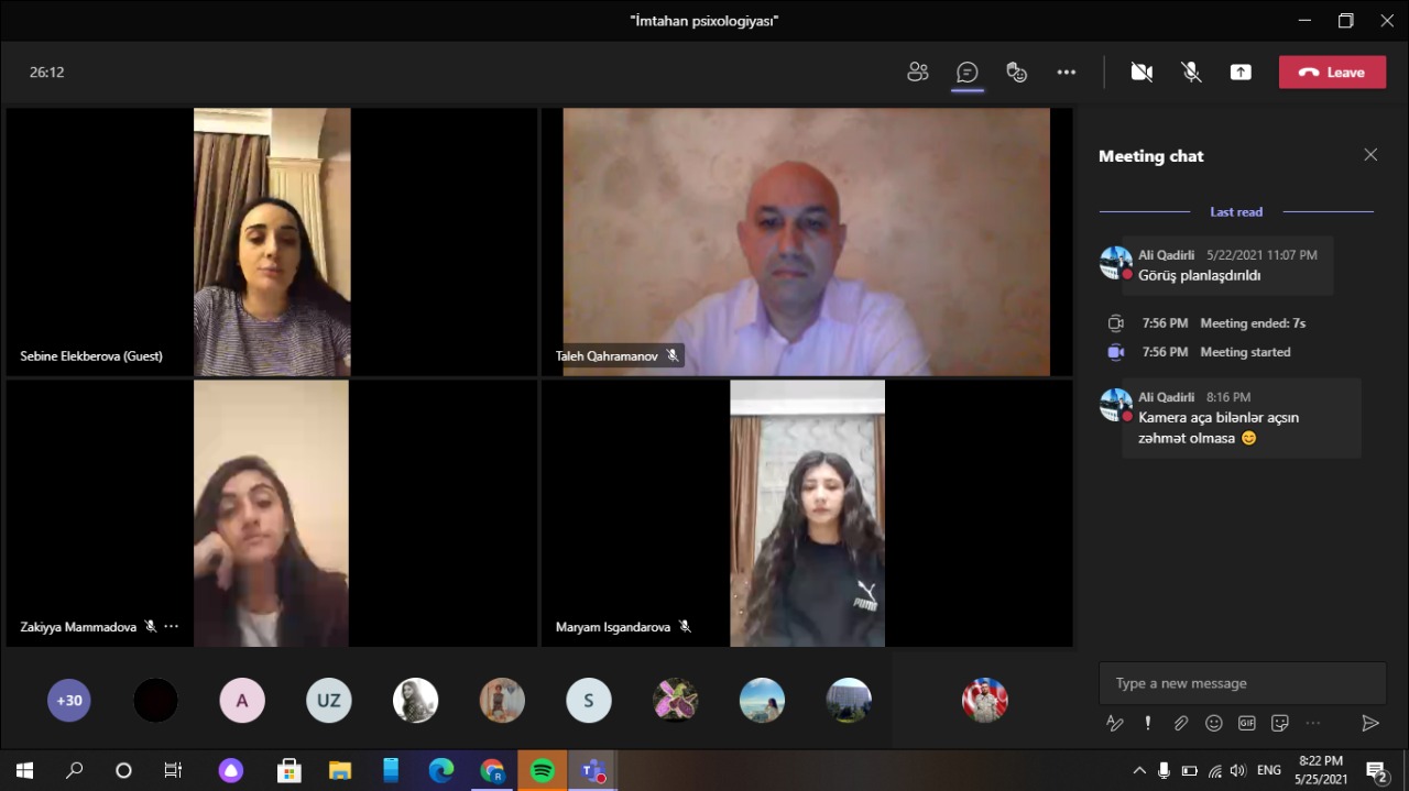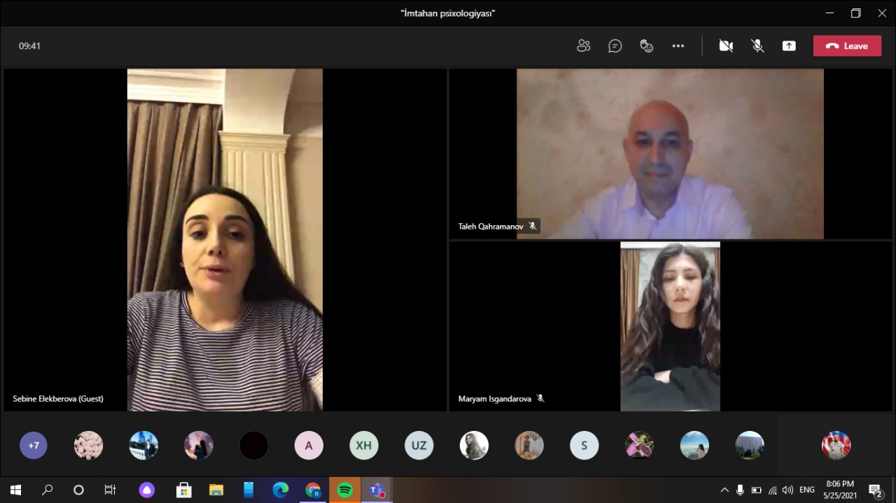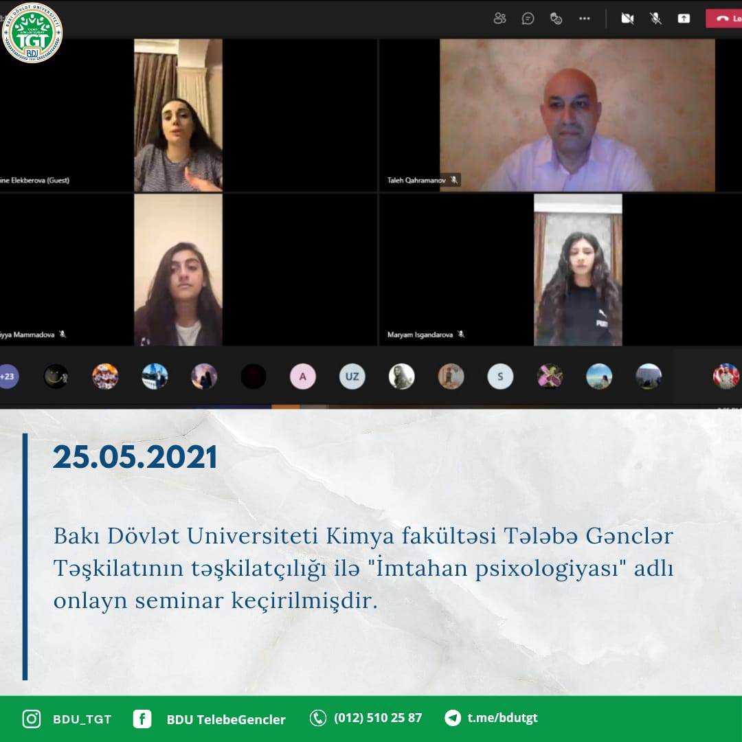 25.05.2021-ci il tarixində Kimya fakültəsi Tələbə Gənclər Təşkilatının təşkilatçılığı ilə "İmtahan psixologiyası" adlı onlayn seminar keçirilmişdir. Seminar Kimya fakültəsi Tələbə Gənclər Təşkilatının idarə heyətinin üzvü İsgəndərova Məryəmin moderatorluğu ilə baş tutmuşdur. Psixologiya Elmi Tədqiqat İnstitutunun psixoloqu Səbinə Ələkbərova tələbələrə imtahan həyacanının aradan qaldırılması ilə bağlı məsləhətlər vermiş və tələbələrin çoxsaylı suallarını cavablandırmışdır. Kimya fakültəsinin dekan müavini Taleh Qəhrəmanov çıxış etmiş və tələbələrə imtahan sessiyasında uğurlar arzulamışdır. Seminar tələbələrin çoxsaylı suallarının cavablandırılması ilə yekunlaşmışdır.