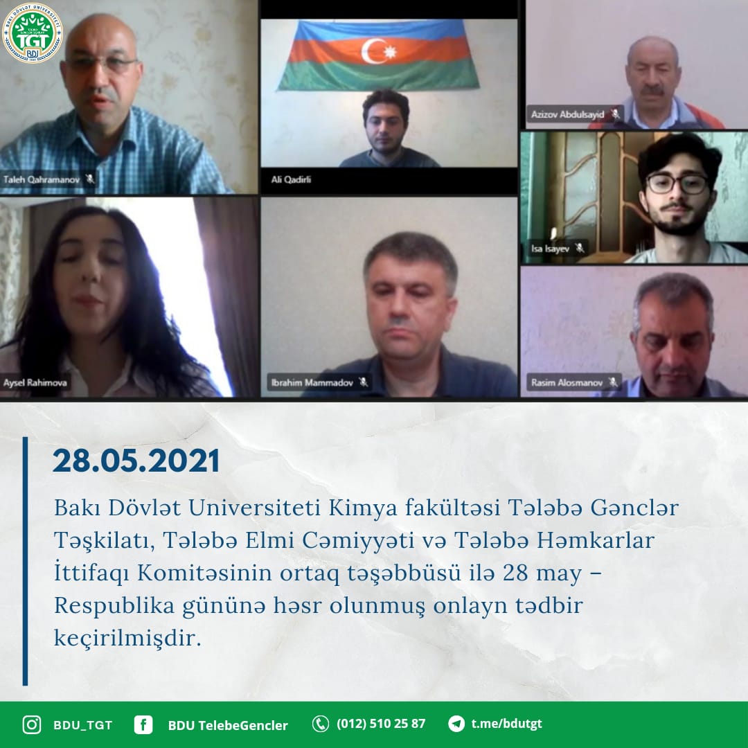 28.05.2021-ci il tarixində Bakı Dövlət Universiteti Kimya fakültəsində tələbə təşkilatlarının – Tələbə Gənclər Təşkilatı, Tələbə Elmi Cəmiyyəti və Tələbə Həmkarlar İttifaqı Komitəsinin ortaq təşəbbüsü ilə 28 May – Respublika Gününə həsr olunmuş onlayn tədbir keçirilib.