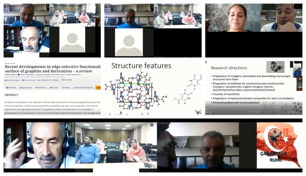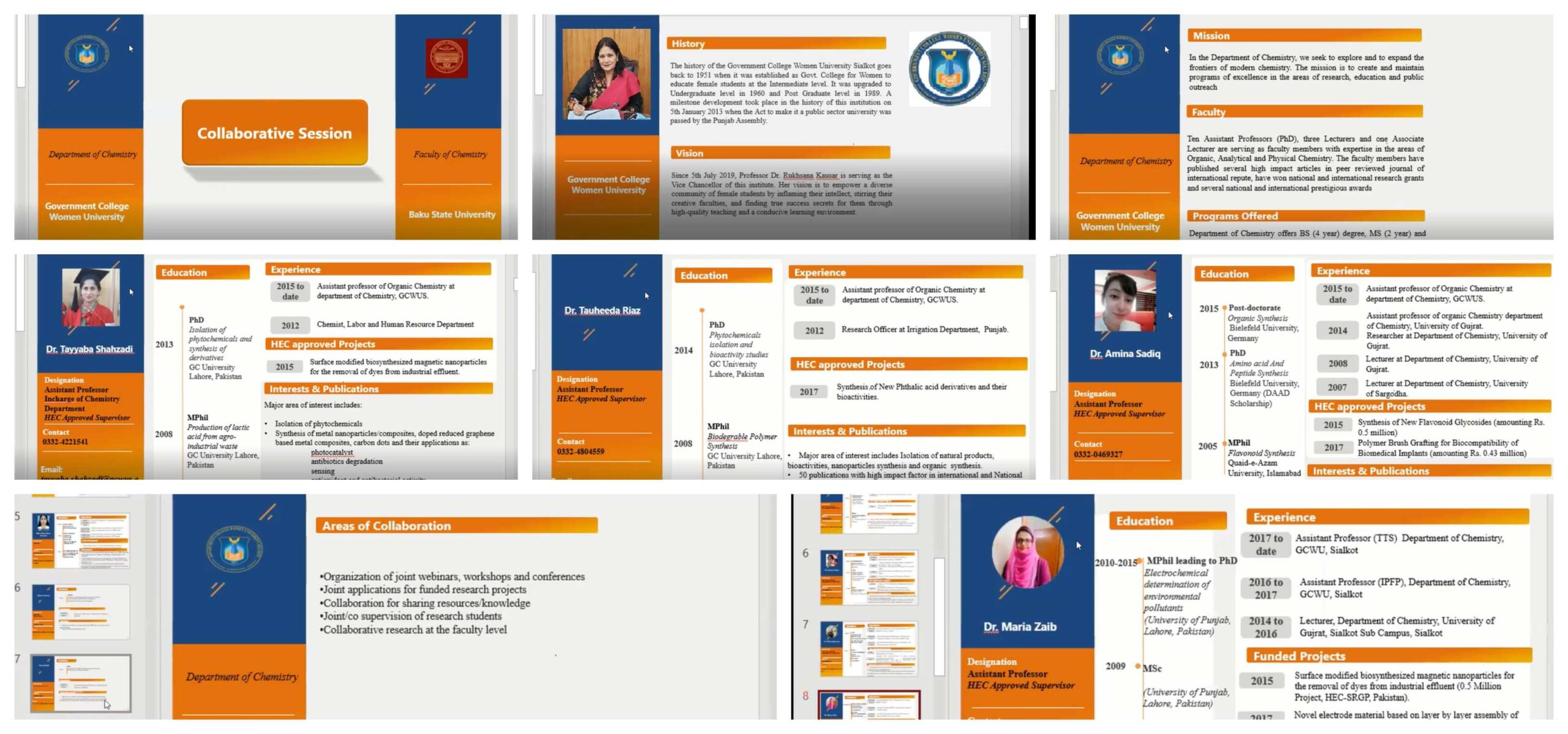 17 sentyabr 2021-ci il tarixində GCWUS (Sialkot Qadın Universiteti Dövlət Kolleci) kimya kafedrası ilə Bakı Dövlət Universitetinin Kimya fakültəsinin əməkdaşları arasında “online” görüş təşkil olunmuşdur. Görüşün məqsədi Bakı Dövlət Universiteti və GCWUS kimya kafedrası arasında elm və təhsil sahəsində mümkün əməkdaşlıq imkanlarını nəzərdən keçirmək olmuşdur. GCWUS kimya kafedrasının müdiri, Dr. Tayyaba Shahzadi görüş iştirakçılarını salamladı və Bakı Dövlət Universitetinin Kimya fakültəsinə təşəkkürlərini bildirərək “online” görüşə moderatorluq etdi. Görüş Bakı Dövlət Universiteti haqqında təqdimat nümayişi və BDU-nun Kimya fakültəsinin dekanı, professor Abdülsəyid Əzizovun nitqi ilə başladı. GCWUS-nin kimya kafedrasının əməkdaşı Dr. H.M.Abd Ur Rahman kafedranın əməkdaşlarının elmi tədqiqatları barədə məlumat verdi. Tədbirdə Bakı Dövlət Universitetinin Kimya fakültəsinin professoru Ülviyyə Həsənova “Bakı Dövlət Universitetinin Kimya fakültəsinin tədqiqat sahələri və istiqamətləri” barədə prezentasiya ilə çıxış etdi. Görüşdə hər iki universitetin əməkdaşları qarşılıqlı maraq doğuran tədqiqat sahələrini qeyd etməklə və müxtəlif əməkdaşlıq imkanlarını müzakirə etdilər. Aşağıda göstərilən istiqamətlər üzrə əməkdaşlıq edilməsi qərara alındı:
