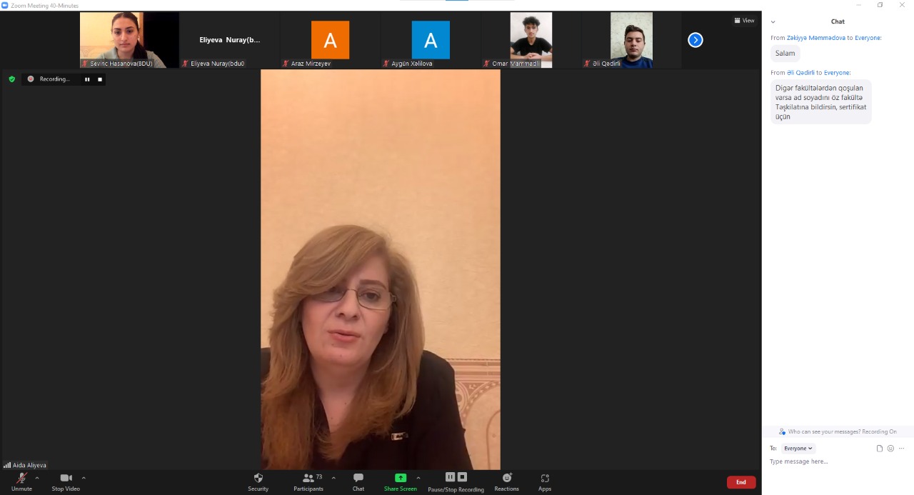 23.10.2021-ci il tarixində Bakı Dövlət Universiteti Kimya fakültəsi Tələbə Gənclər Təşkilatının üzvü Sevinc Həsənovanın təşkilatçılığı ilə onlayn rejimdə Türkiyə Cümhuriyyəti Fırat Universitetində magistr təhsili almış pedaqoq-psixoloq Aidə Əliyeva tərəfindən təlim keçirilmişdir. Aidə Əliyeva təlim iştirakçılarına "Pedaqoji cəhətdən sinfin idarə edilməsi" mövzusunda məruzə ilə çıxış etmiş, respublikamızda aparılan təhsil islahatlarının pedaqoji innovasiyalara geniş imkanlar yaratdığını, avropa təhsil standartlarına uyğun gələn yeniliklər aparmağın, innovasiyaları tətbiq etməyin zəruri olduğunu, müəllimlərin peşəkarlıq və səriştəlilik səviyyəsinin artırılmasının bu zəruriyyətdən irəli gələrək günümüzün prioritet vəzifələrindən birinə çevrildiyini qeyd etmişdir. Kimya fakültəsi Tələbə Gənclər Təşkilatının sədri Əli Qədirli Aidə xanıma görüşdə iştirakına görə təşəkkür etmiş, bu tip tədbirlərin davamlı olacağına əminliyini bildirmışdir. Təlimdən sonra iştirakçılar sertifikatla təltif olunmuşdur.