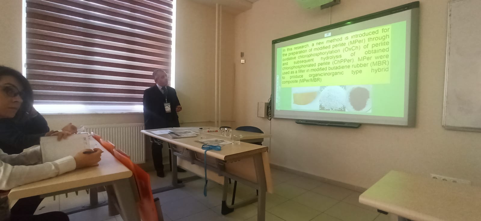 “Yüksəkmolekullu birləşmələr kimyası” kafedrasının müdiri, kimya elmləri doktoru, professor Rasim Alosmanov Türkiyə Respublikasının Bitlis şəhərində 4-6 noyabr tarixlərində keçirilən “Pomza və Perlit Beynəlxalq Simpoziumunda” “Funksionallaşdırılmış perlit/modifikasiya edilmiş butadien kauçuku hibrid kompozitinin adsorbsiya xassələri” mövzusunda məruzə ilə çıxış etmişdir. Təqdim edilən məruzə iştirakçıların marağına səbəb olmuşdur. Gələləcəkdə bu sahədə elmi tədqiqat işlərinin genişləndirilməsi məqsədilə bir sıra universitet nümayəndələri tərəfindən birgə əməkdaşlıq təklifi müzakirə olunmuşdur.