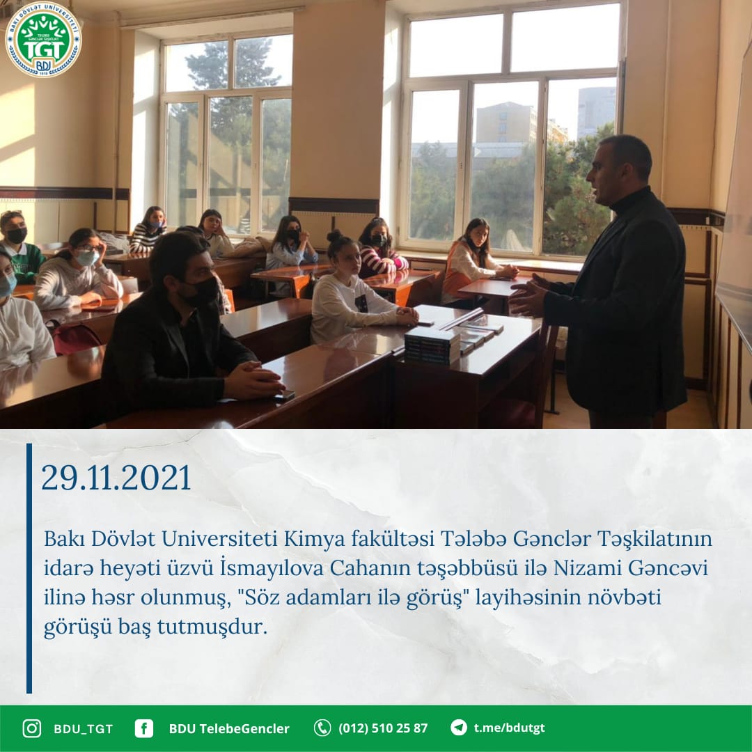 29.11.2021-ci il tarixində Bakı Dövlət Universiteti Kimya fakültəsi Tələbə Gənclər Təşkilatının idarə heyətinin üzvü İsmayılova Cahanın təşəbbüsü ilə Nizami Gəncəvi ilinə həsr olunmuş, "Söz adamları ilə görüş" layihəsinin növbəti görüşü baş tutmuşdur. Görüşün qonağı Azərbaycan yazıçısı Elbrus Kəlbiyev olmuşdur. Tədbirdə Cahan İsmayılova layihə və yazıçı Elbrus Kəlbiyev haqqında məlumat vermişdi. Elbrus Kəlbiyev öz həyat və yaradıcılığı, əsərləri haqqında məlumat vermiş, "Şahmat qaydaları ilə qətl", "Ölülərin pıçıltısı", "Kobranın ölüm rəqsi" və "Şeytan ruhunun ləpiri" kitablarını imzalayaraq tələbələrə hədiyyə etmişdir. Yazıçı tərəfindən tələbələri maraqlandıran suallar cavablandırılmışdır. Tədbirin sonunda Bakı Dövlət Universiteti Kimya fakültəsi Tələbə Gənclər Təşkilatının sədri Əli Qədirli çıxış edərək yazıçıya və layihə rəhbərinə təşəkkürünü bildirmişdir.