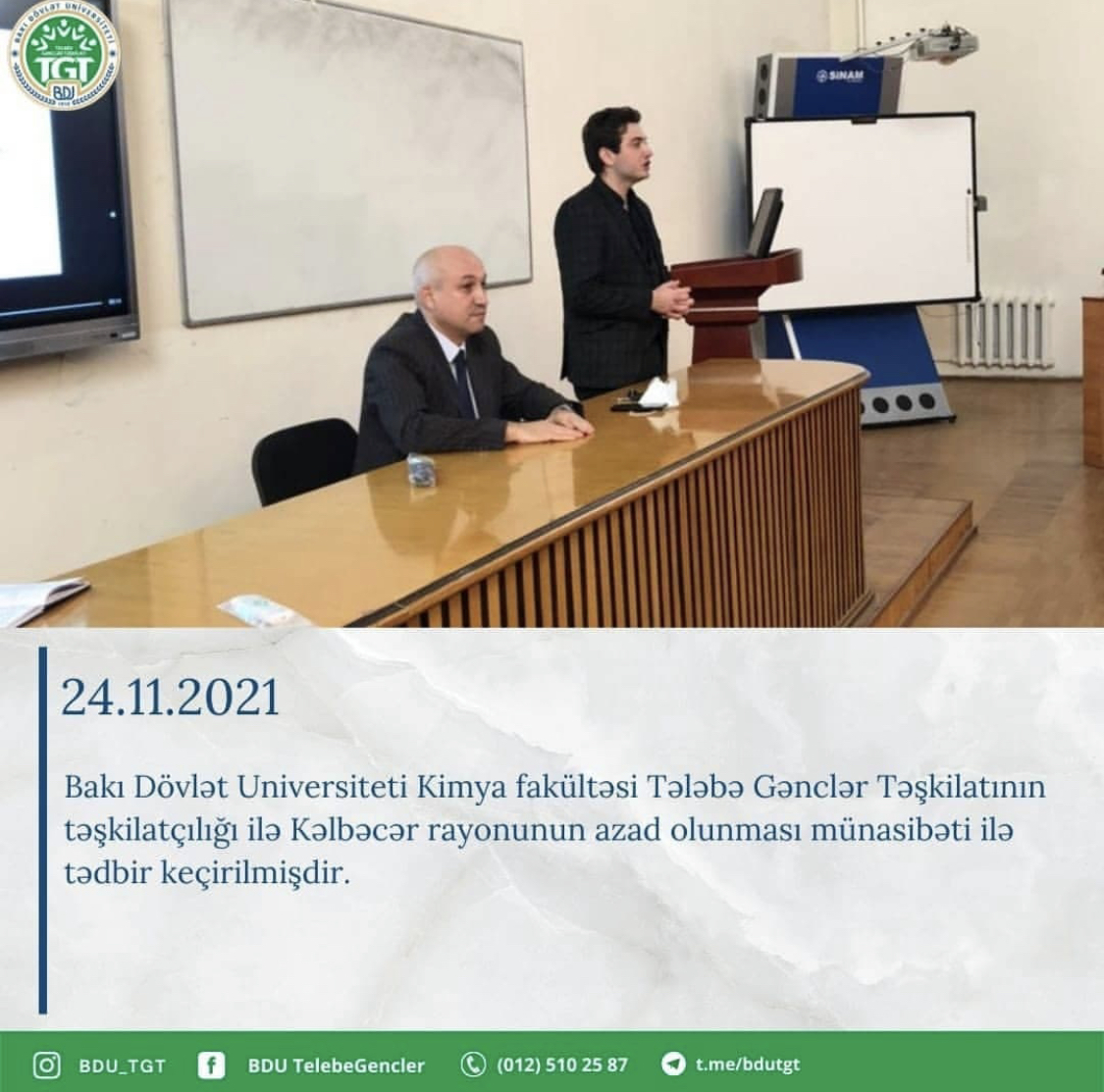 24.11.2021-ci il tarixində Bakı Dövlət Universiteti Kimya fakültəsi Tələbə Gənclər Təşkilatının təşkilatçılığı ilə Kəlbəcər rayonunun işğaldan azad olunmasının ildönümü münasibəti ilə tədbir keçirilmişdir. Kimya fakültəsi Tələbə Gənclər Təşkilatının sədri Əli Qədirli tədbiri açıq elan etdi və şəhidlərin əziz xatirəsi 1 dəqiqəlik sükutla yad edildi. Tədbirdə Kimya fakültəsinin Sosial məsələlər və Tələbələrlə iş üzrə dekan müavini Taleh Qəhramanov Ali Baş Komandan, İlham Əliyevin rəhbərliyi ilə döyüş meydanında və siyasi müstəvidə qazanılan qələbədən, müzəffər ordumuzun yenilməzliyindən bəhs etmişdir. Tədbirdə həmçinin Kimya fakültəsinin 1-ci kurs tələbəsi Mehriban Ağabəyli Kəlbəcərin tarixən Azərbaycan torpağı olması, vaxtı ilə olan zəngin sərvətləri və mənfur qonşularımızın o sərvətləri necə taladığı haqqında məlumat verdi. Tədbirdə Kimya fakültəsi Tələbə Gənclər Təşkilatının idarə heyəti üzvü Yusifov Yusifin hazırladığı videoçarx təqdim olundu.